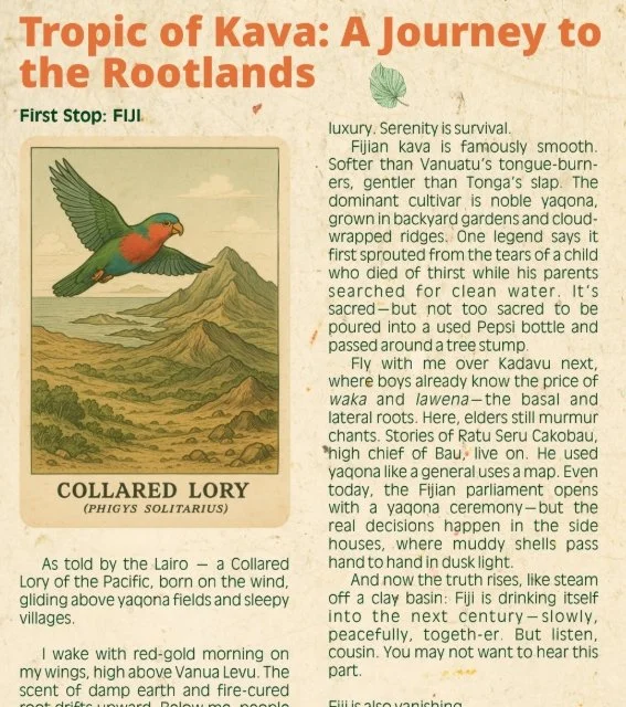 In this first dispatch of Islands in the Shell, we begin where the water speaks softest and the root runs deepest: Fiji. Not a dot on your travel map, but a place where kava is not a drink—it’s a bloodstream. I should know. I’ve watched it swirl in coconut shells long before anyone gave it a Latin name.